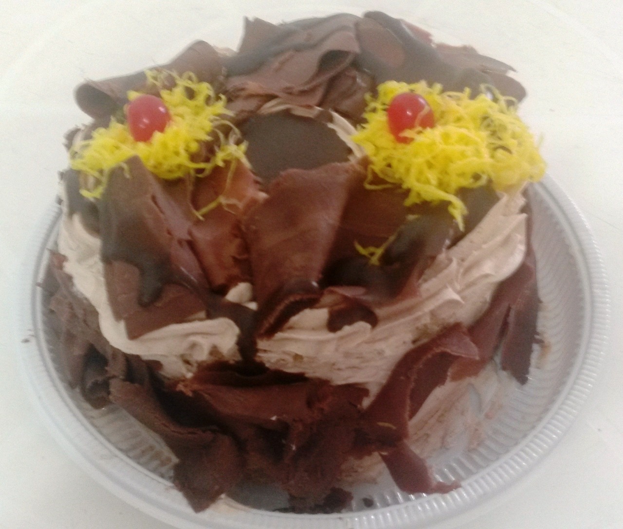 Coberta com chantilly de chocolate, raspas de chocolate e cereja.